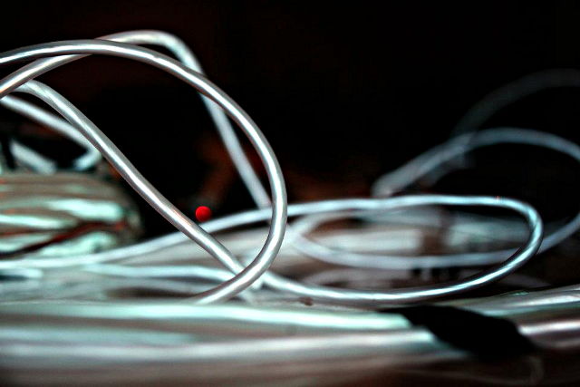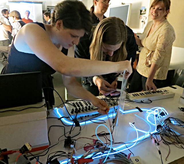 Here are Laurence Sarrazin and Tobias Berblinger reprogramming the sequencers, while Kathryn tries "playing" the lights.