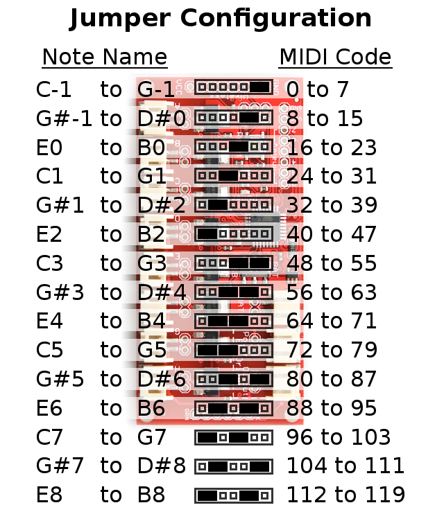 The same signal goes to all 15 boards. Jumpers on the edge of the board configure which 8 notes each board will "play".