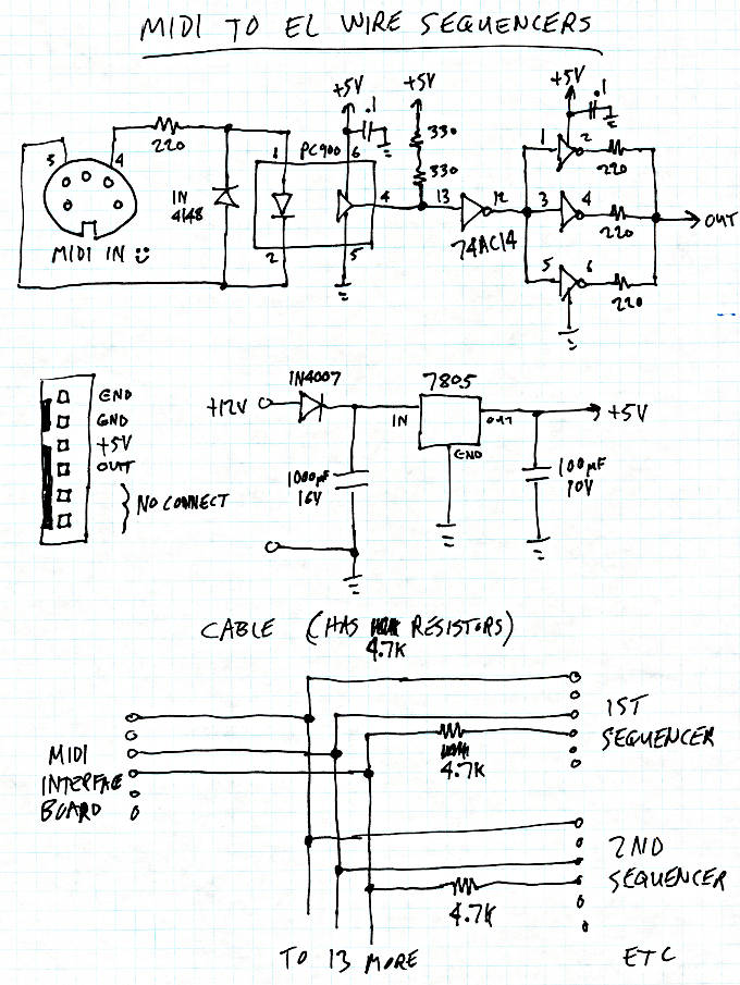 An important point is the 4.7K resistors in the cable. The sequencers have AVR chips running at 3.3 volts, so these resistors prevent the 5 volt signal from damaging them.