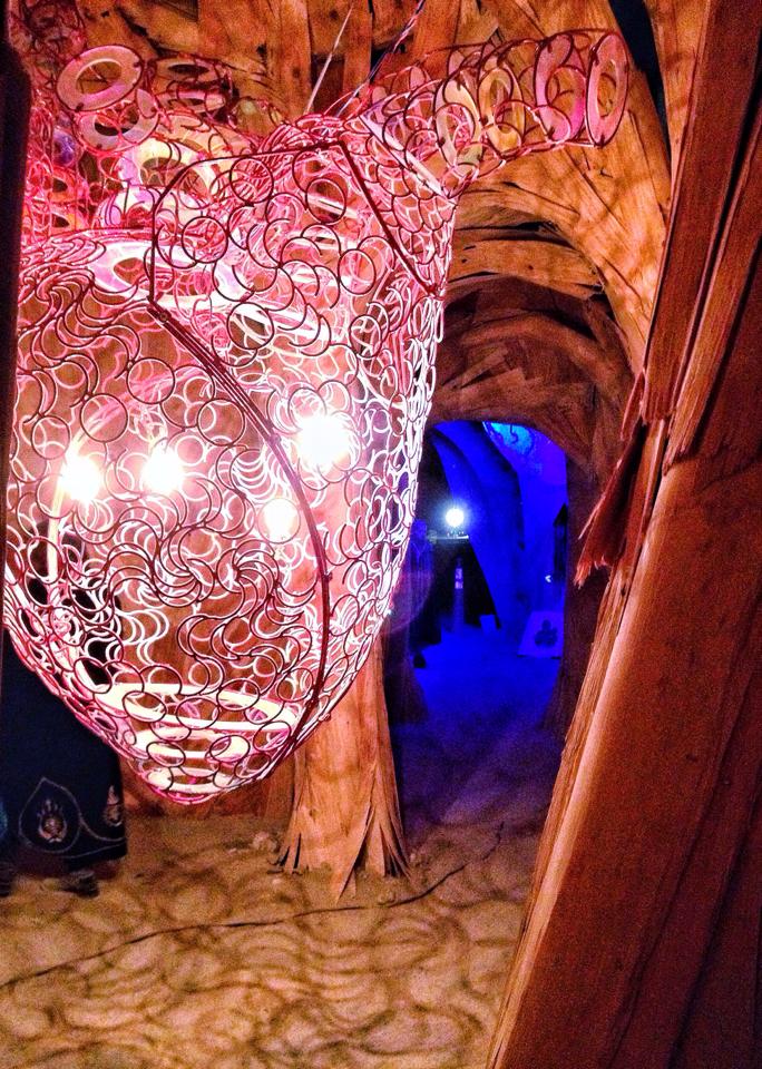 Inside were 2 hearts, one made here in Portland by Lostmachine Andy & other burners at Flat Rat Studios. I made electronics to gradually fade 4 incandescent light bulbs in heart beating patterns.