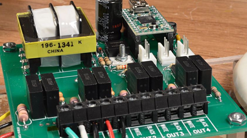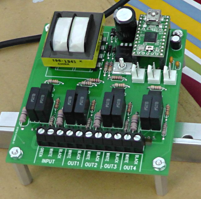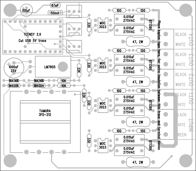 The AC switching circuitry was basically Fairchild Semiconductor's recommended circuit for the MOC3023 optical isolator, which allows a Teensy 2.0 board to safely control the AC voltage. Four copies of this circuit were built on the board.