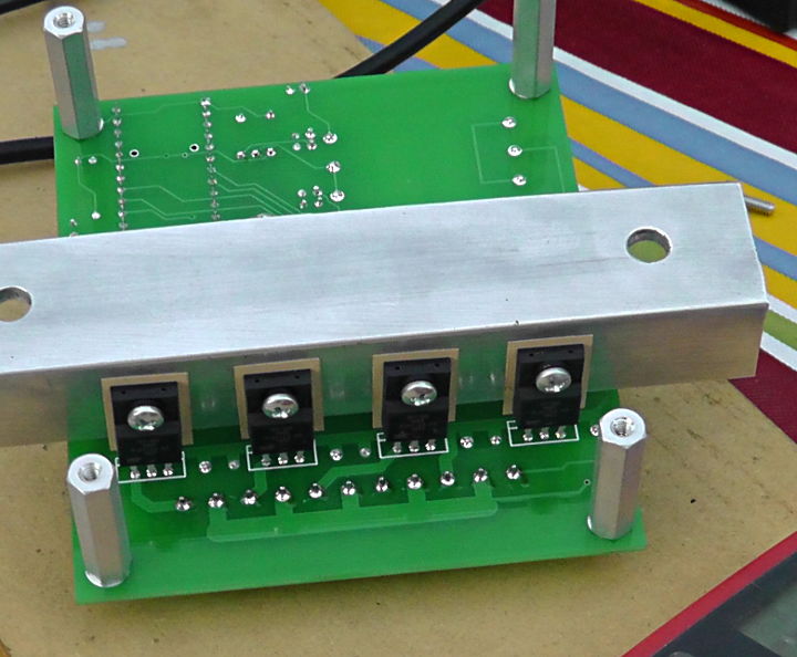 The four BT139X Triacs that actually switch the AC voltage are mounted on the bottom side to a heatsink that's meant to dissipate any heat to the metal case. Originally Andy believed the lights might be 500 watts each, so I was concerned about heat. In the end, four 60 watt bulbs were used and the Triacs did not get noticeably warm.