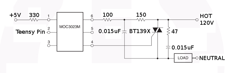 This circuit requires the Teensy 2.0 to know the AC voltage timing, so it can trigger the Triac at the right moment. Triggering early in the AC waveform causes the Triac to conduct near the full AC voltage for maximum brightness. Triggering later reduces the brightness.