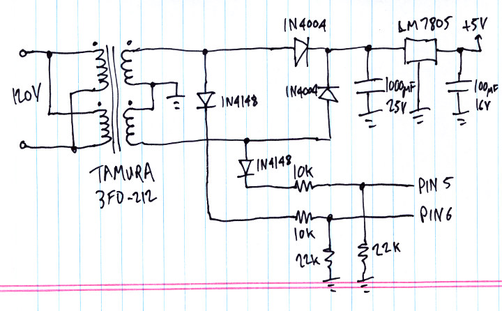 The Teensy 2.0 receives pulses on pins 5 and 6 as the AC waveform cycles positive and negative.