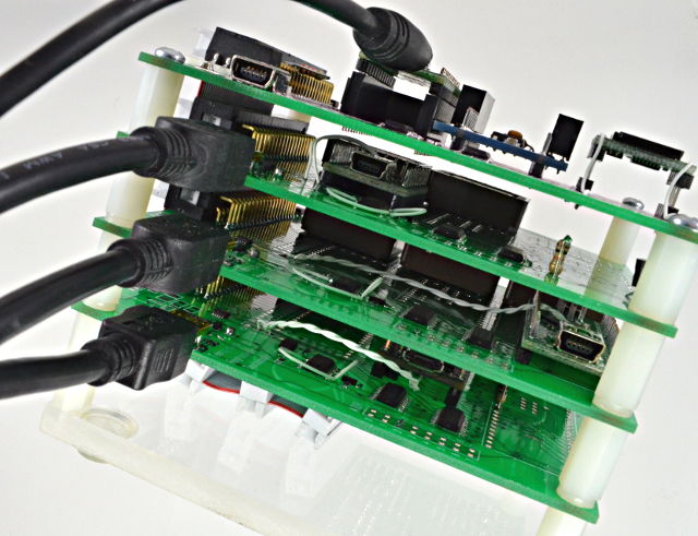 The main idea, which began in November 2012, behind this test is the use of AD75019 switch matrix chips to allow the control board (on top) to configure which pins on the other 3 boards (the test boards, each with a different Teensy) connect to each other and to various peripheral hardware.
